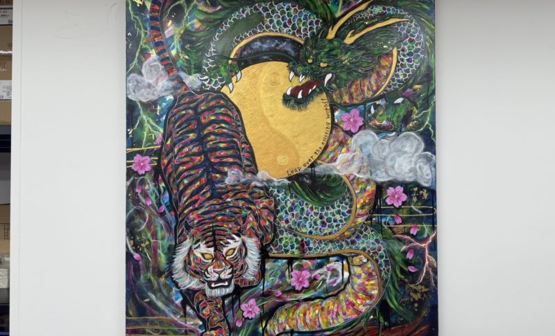 インストリープをテーマに書いて頂いた絵画で、虎で力強さを、龍で飛翔感を表現してもらっています。また稲妻は電気を表しており、電気工事会社として羽ばたこう(LEAP)とする会社にぴったりの作品となりました!
